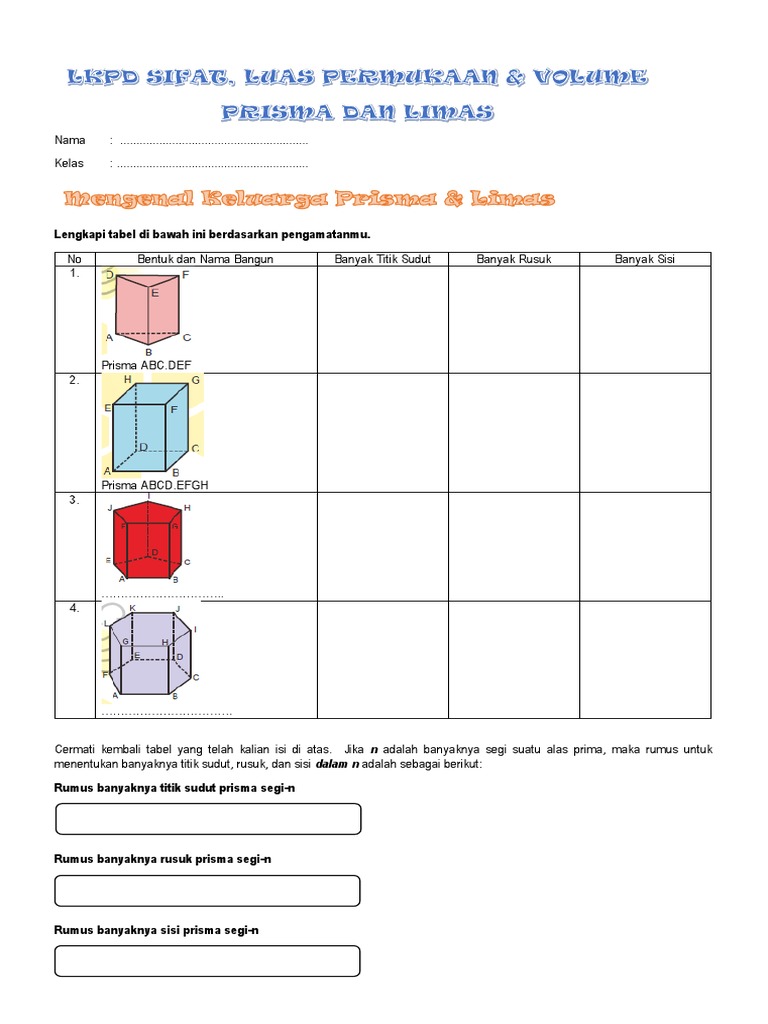 Modul panduan guru tahun 3 pages 601 650 flip pdf download fliphtml5. Bangun ruang ini terdiri dari beberapa bentuk termasuk: Prisma segitiga = n+2 = 3+2 = 5 buah sisi; A) terdapat dua bidang yang sejajar dan kongruen (bentuk dan ukurannya sama) yaitu bidang alas dan bidang tutup. Bentuk alas dan atap prisma bersifat kongruen (sama dan sebangun). Kalo kamu pengen nyari volume dari prisma atau luas permukaan prisma, kamu bisa banget nih gunain rumus di bawah ini. Materi yang akan kita pelajari kali ini adalah cara menghitung volume pada bangun ruang prisma. Bentuk adalah unsur seni rupa yang terbentuk karena ruang atau volume. Di bawah ini yang bukan termasuk jaring jaring prisma segitiga adalah brainly co id. Kubus, balok, silinder/ tabung, piramida, kerucut, bola, belahan, prisma dan banyak lagi.ada berbagai aplikasi dari bentuk tiga dimensi. Prisma adalah bangun ruang yang dibatasi oleh dua buah bidang sejajar sama besar dimana bidang tersebut merupakan bidang tutup dan bidang alas. Modul panduan guru tahun 3 pages 601 650 flip pdf download fliphtml5. Contoh beberapa bentuk 3d atau bangun ruang adalah: